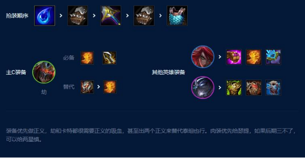 三、装备推荐 1、选秀优先抢水滴-拳套-大剑的顺序 2、主C劫正义和无尽必备,第三件可以带泰坦;剩余法术装备可以给卡特离子、法爆、正义等。 3、主坦慎带冰心、反甲、狂徒等肉装。