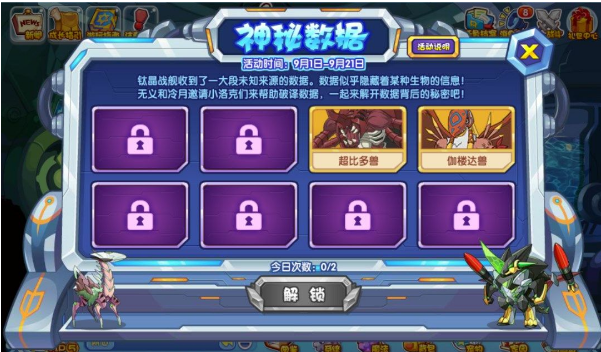 每天可以解锁随机的两个宠物数据,点开之后会限制两种不同的属性进行模拟挑战,战斗胜利则解锁进度+50%,两个不同的属性均满足挑战任务就能解锁数码宝贝的形象啦!注意,只能是主属性符合的宠物挑战,其他副属性的宠物无效哦。
