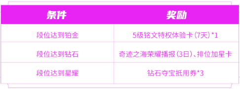 介绍:玩家们在活动卡其之后达到了指定的段位之后便可以获得钻石夺宝抵用券、5级铭文特权体验卡、奇迹之海荣耀播报、排位加星卡等这些好礼。