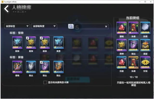 这套卡牌的操作方法和上一套是差不多的,都是先用机敏,豁达,慷慨这三张卡让玩家在关卡内刷更多钱,之后在通过用怪物卡,让关卡内生成更多精英怪物,以此提高稀有物品的爆率。卡牌中的渴望也是提高关卡内怪物掉落物数量的。