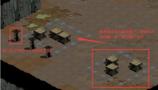 3、进入山洞后,完成木笼机关;(每个木笼机关都有一个固定区和一个操纵区
