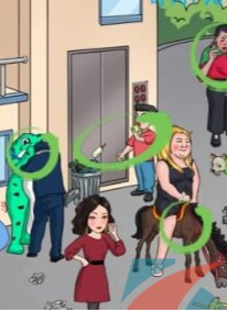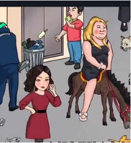 1、比较明显的有车牌数字的社死,骑着小马的女人,然后是撞衫的社死。
