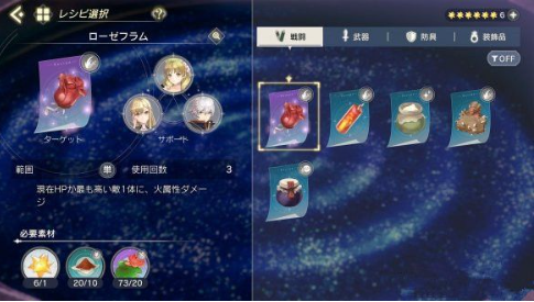 获得配方后,选择一起调和的角色及素材,善用角色的「天赋颜色」及特性制作道具。