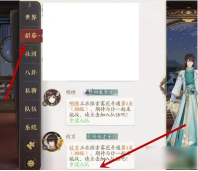 在游戏主界面翻开谈天框进入招募频道,请求入队进入其他人的雾苑奇遇部队也能够,这便是雾苑奇遇的方位。