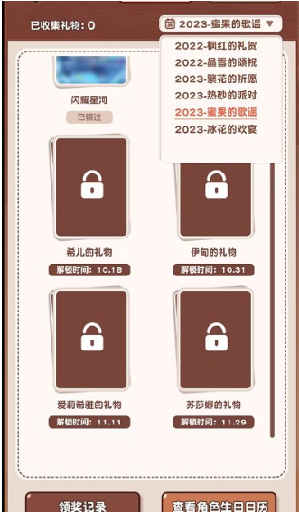 3、领取不同时期角色生日礼物礼盒,还可以查看历届礼物的详情。