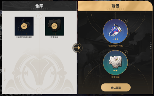 4、打开背包后选择两个道具点击【确认领取】即可发送到游戏账号里面,需要注意的是该页面只能选择两个道具进行领取,所以在领取的时候一定要想好是否是自己需要的道具。