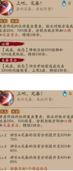 此外,如果目标带有定春重伤,也就是普攻的毒伤的话,该目标受到单体攻击会提高神乐的5%行动条。