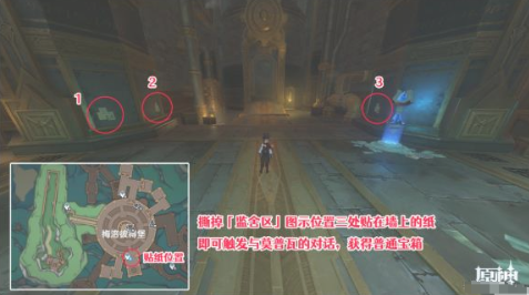1号宝箱:玩家们传送到下侧的锚点,传送过去之后就可看见这边的墙上贴有三张壁纸,玩家们将他们给撕下来之后就可以和莫普瓦进行对话就能够获得一个普通的宝箱;