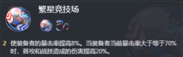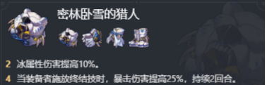 2件套的效果是必备的4件套的效果 释放终结技后,暴击伤害提高25%,持续2回合,收益还是比较高的,且终结技一般会跟强化战技一起放,强化战技一般都能吃满2回合的暴击伤害提升。