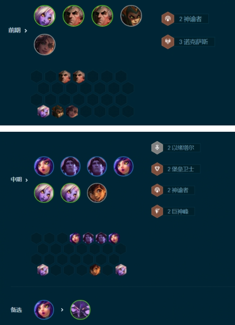 针对1费、2费卡为主C的阵容。2阶段可不升级。前期只拿目标英雄,可以考虑打连败,在3-1四人口冲刺D牌,将所有体系卡搜到2星及以上。1费卡核心阵容,且来牌较顺则可以把钱花完搜卡。之后稳血养经济,使用利息搜其他牌三星或者升人口补充更多羁绊和英雄。