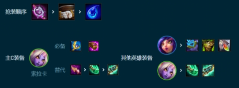 主C索拉卡:大天使+珠光护手+纳什之牙/鬼索/青龙刀。主坦卡萨丁/妮蔻:离子火花+狂徒+救赎。这套阵容的爆发输出虽然不高,但是坦度是十分可观的,经常能拖入加时赛,所以我们优先考虑做炽天使给索拉卡,随着时间的累积,炽天使所带来的法强会越来越高,索拉卡技能从而能达到秒杀敌方棋子的效果。