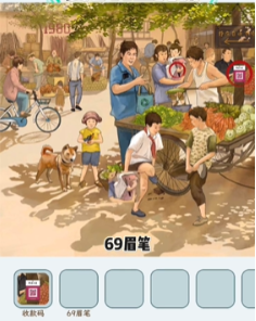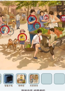 2、胸口上的二维码,小狗旁边小孩手上的鸡哔你,自行车后面的人穿着的背带裤。