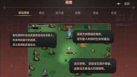 玩家可自主搭配武器组合,角色自动打怪,玩家用方向键控制角色移动和躲避,消灭怪物后获得宝石,提升战斗等级,不断越级挑战,就能轻松通关。