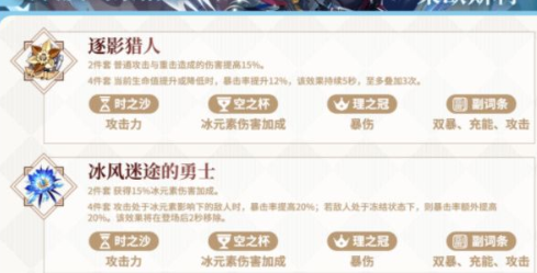 冰风迷途的勇士部分适配莱欧斯利,在永冻队中最优先推荐的圣遗物套装。遗憾的是不适合莱欧融化队,在面对某些自挂元素的怪物时几乎是白板。