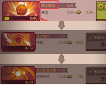2、第四个部位(格挡)点到10级,第三个部位(战士暴击)和第五个部位(战士技能伤害)点满。