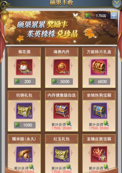 活动期间,玩家可在硕果丰收商店消耗茱萸叶兑换珍稀道具奖励;