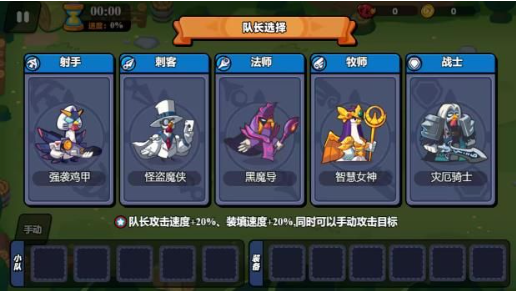 玩家们可以在游戏中选择不同的角色来组成战队,最多可以上阵五个角色。而游戏中的角色定位各不相同,分别为战士、刺客、射手、法师和牧师,每种定位的小鸡角色技能效果也不同。接下来,小钗将介绍两个比较实用的阵容。