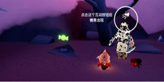 5、第五个在万圣地图入口,需要第一周触发,从遇境传送过来后先祖就在正前方,点击先祖头上的互动按钮触发魔法,然后糖果出现在左边餐盘处,如无法收集就先取消当前魔法。