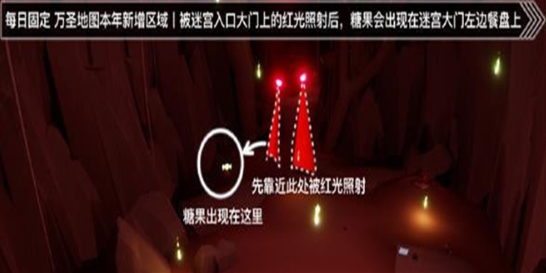 6、第六个也是每天固定的位置,万圣地图本年新增区域,被迷宫入口大门上的红光照射后,糖果会出现在迷宫大门左边餐盘上。