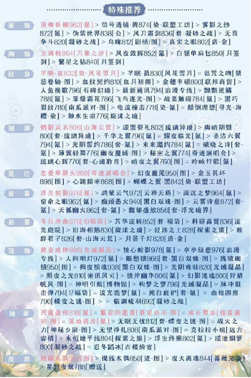 6.袜套:轻挽花葶3585[氟]>枯骨-入夜3180[魑魅魍魉」>流沙若金31401星:雨祈愿-图]>宇宙尘埃3090[苍穹秘轨]>无形枷锁3085[禁忌卷轴图]>陨星轨迹3055[染-成就]>荒野行路3050[云空之境]=珍珠星斗[苍穹秘轨]>荒原旅途3045[云空之境]>塔罗3040[分解礼盒]