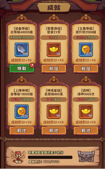 4、任务分为每日任务和成就任务,达标了有各种道具奖励,每天把所有的每日任务做完,还能达成周常。成就任务中的装备等级,可以把寒铁平均到五个将身上,以最快的速度拿到4万级的达标。