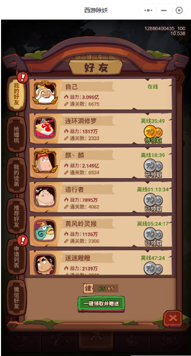 有了好友可以抢蟠桃,三种桃子每种每天可以领取3次,如果有人老是抢你的桃子,就删了他这个好友,建议抢没人占着的,不要四处树敌哦。我的徒弟那可以捉5个给你打工,你也有可能为别人打工。如果被捉了不要急,叫帮里的大佬来解救,他多刷新几次有可能会找到你,如果刷不到,就只能靠自己了,趁师父只有1个将在推图的时候,你上:不动明王,龙王,孙悟空,嫦娥,阎罗王这5个将去反叛,可以1亿战力打百亿成功。