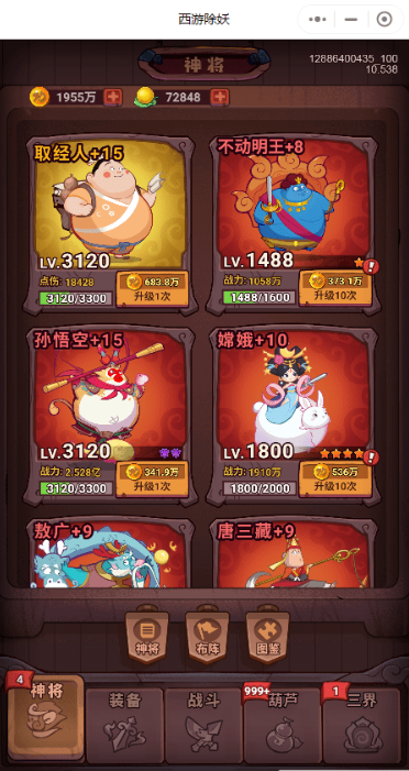 1、第一页显示取经人和你上阵的神将,可以在这里对上阵的神将进行升级升星布阵等操作。神将的等级不能超过取经人,前期可以只升取经人和主将,其它4个将升到1000级出4技能就可以先用着了,刚来功德和进阶丹是很缺的。