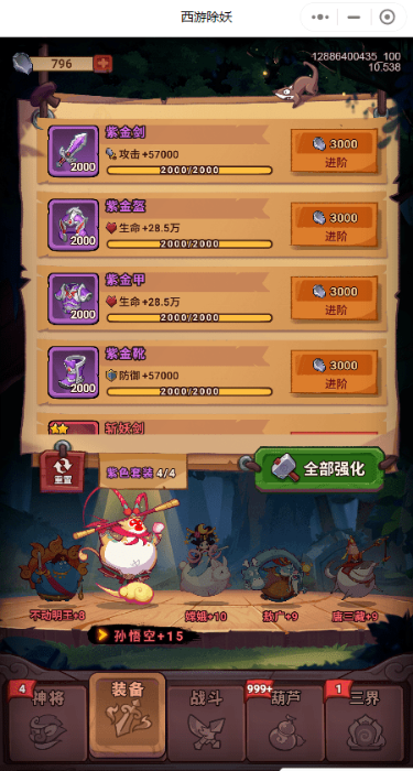 2、关卡进度:上面第6666关,是关卡的关数,每一关分为7个小回合,前面6回合打怪,第7回合打葫芦,并获得当前的葫芦道具,这个是功德和葫芦的主要来源之一,在主将能过关的时候尽量上1个将,节省推关时间。如果1个将打不过了,可以在他的前面放几个同属性的别的1级红将,给他加五行BUFF加成和五将总星级加成。如果将会被怪打死,就洗两个吸血的令牌(一个是暴击吸血,一个是普通吸血),再不行后面站个加血的神将,比如嫦娥。