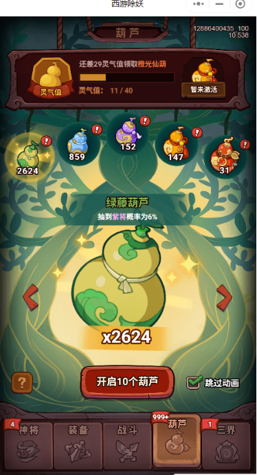 开葫芦要跟着葫芦周常活动走,开的顺序是看自己差什么材料就开什么,不要急着一下开完,反正活动周有七天,慢慢跟着推图进度走,要什么材料了再开。每开一个绿葫芦灵气值加1,蓝色的加10,紫色加20,橙色加50.红色的不加分。灵气值达标了又会返还葫芦,每开500灵气值的葫芦,就会返还260分的葫芦。