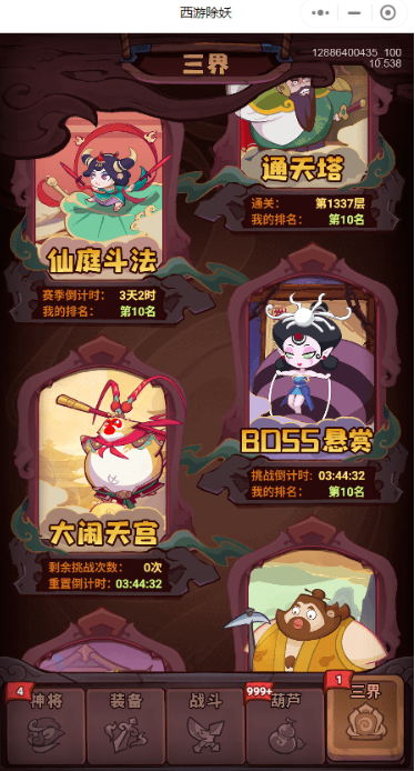 通天塔,仙庭斗法,BOSS悬赏,大闹天宫,灵山采石,试练秘境,五行秘境,跨服斗法,九霄之颠