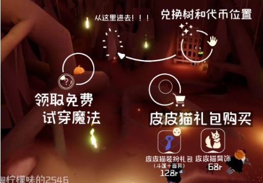 2、跳进去之后,在门口左侧可以领取免费的试穿魔法,右侧是万圣节礼包的购买;