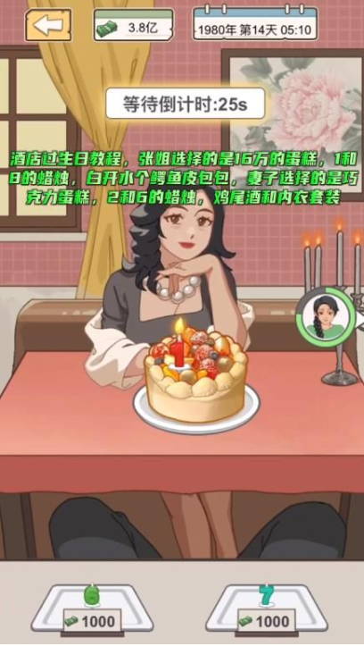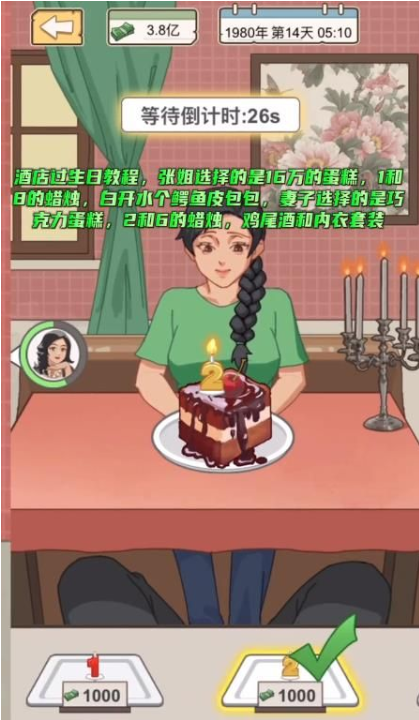 张姐选择的是16万的蛋糕,1和日的蜡烛,白开水个鳄鱼皮包包,妻子选择的是巧克力蛋糕,2和6的蜡烛,鸡尾酒和内衣套装。