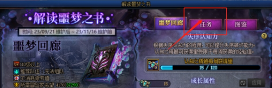 2、这个就是噩梦回廊的玩法界面,在这里点击右上角中间一个【任务】栏,就可以打开任务界面;