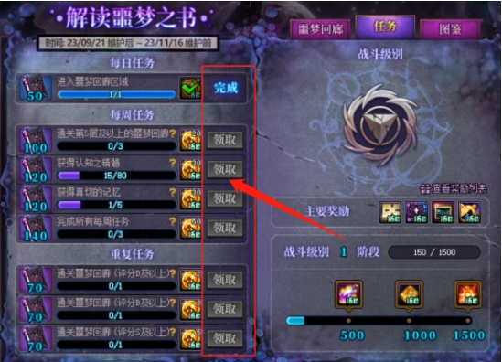 4、玩家通过刷【噩梦回廊】获得【噩梦硬币】就可以提高战斗等级,等到达相应的等级玩家点击图标就可以领取了。