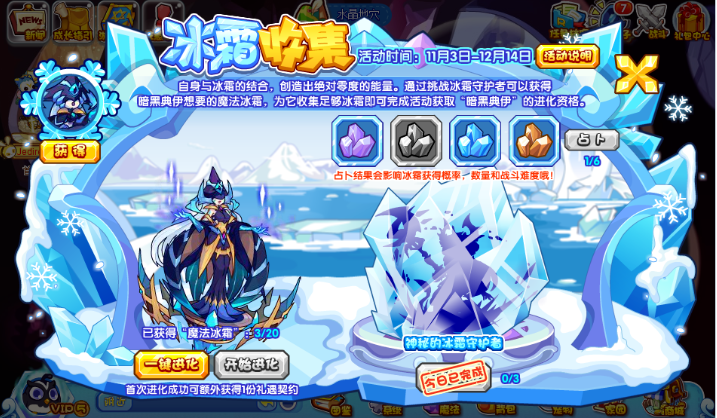 水晶数种类决定挑战难度和战胜后获得的魔法冰霜数量,点亮水晶越多,挑战难度越低,获得魔法冰霜越多!
