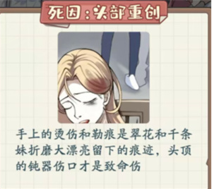 手上的烫伤和勒痕是翠花和千条妹折磨大漂亮留下的痕迹,头顶的钝器伤口才是致命伤。