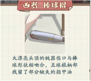 大漂亮头顶的钝器伤口与棒球形状相吻合,且球棍柄部残留了部分缺失的指甲油。