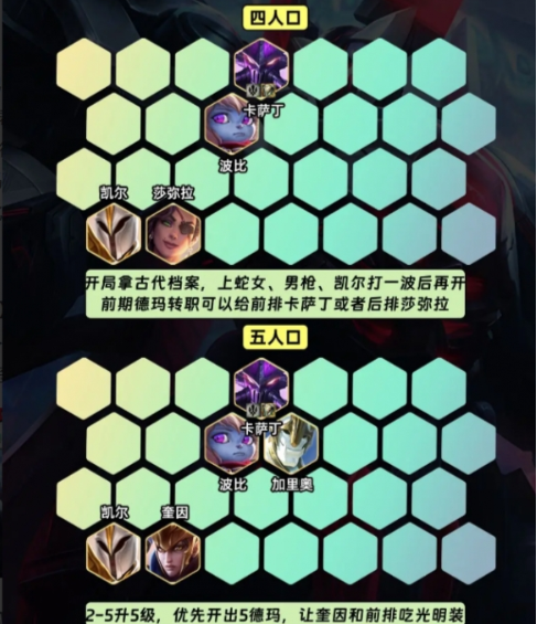 2-5升5级,5级优先开出5德玛,奎因和前排坦克优先吃德玛光明装
