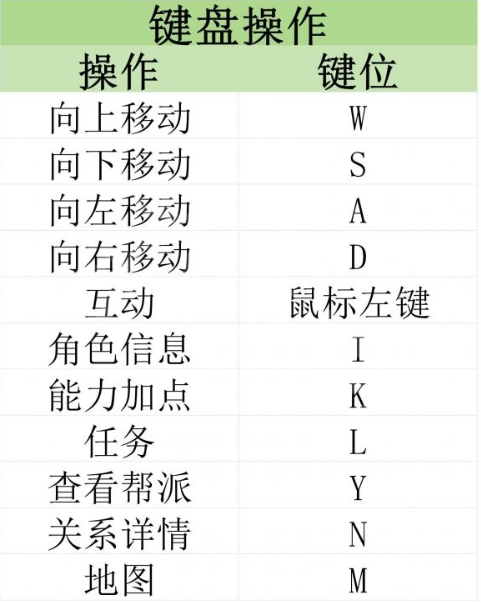 移动为WASD,奔跑左Shift,普通交互 鼠标左键,更多互动 鼠标右键,打开角色界面(背包)I,打开能力界面K,打开任务界面L,打开帮派界面Y,打开关系界面N,打开地图M,暂停Esc。