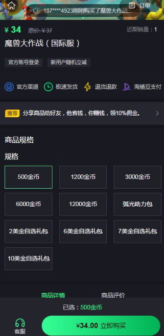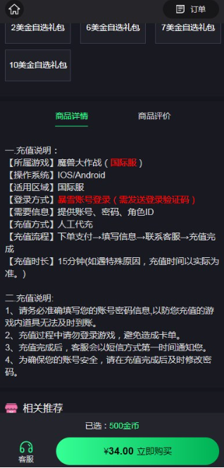 第二步、打开代充网站之后直接就是“魔兽大作战国际服”的充值界面,充值的规格有很多种,玩家可以按照个人的需求去选择对应的充值金额。