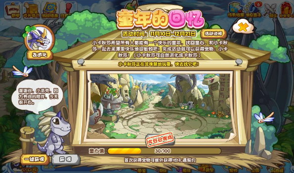 洛克王国童年的回忆活动怎么玩?本周开启童年回忆的全新玩法,希望玩家们都有一个快乐的童年吗,可以和小卡秋莎一起去寻找童年的回忆,游戏之中的小卡秋莎也是可以自然的进化的哦,非常有趣味的回忆玩法,一起回顾童年吧。
