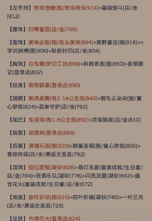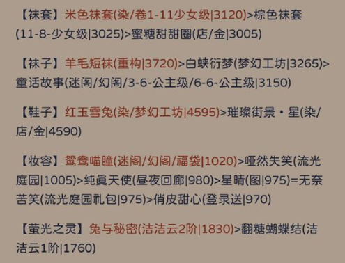 9.妆容:鸳鸯喵瞳(迷阁/幻阁/福袋|1020)>哑然失笑(流光庭园|1005)>纯眞天使(昼夜回廊|980)>星晴(图|975)=无奈苦笑(流光庭园礼包|975)>俏皮甜心(登录送|970)