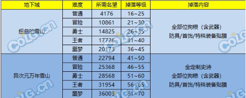 2个地下城入场所需名望以及掉落内容、掉落等级如下,掉落等级几率单个词条暴击,暴击时下限与上限均+5,例如噩梦异次元雪山暴击时,则从61~70变71~75,但暴击随缘也没啥提示。