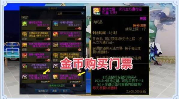 其次,消耗“240万金币”,可购买1张“无限门票(1天)”,账号限购1次,给一个角色无限刷1天,按照1天24次计算,1张门票10万金币,如果再吃“1、5、10、20、50、156”疲劳药刷,成本还要低,疲劳药多的兄弟,可以考虑。