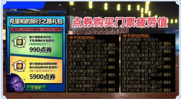 【克里帕的旅行之路礼包】售价990点券,每周限购2次,核心道具包括“10张门票、1瓶50点疲劳药、1个史诗之路宠物/光环/称号”。
