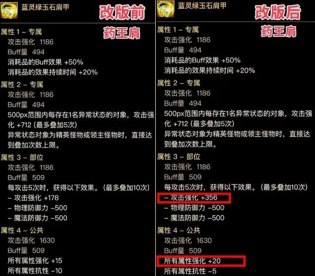 神界改版后,“药王肩”毕业词条,淘汰了“单15”,启用了“小攻强”,组成【消耗品buff、领主攻强、全15、小攻强】的究极毕业词条。
