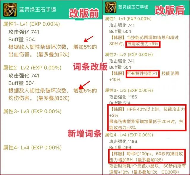 专属词条“自身异抗超过30%,属强增加35”,改版为“异抗10%增加35属强”,可以无脑触发了,直伤流可构建【全15、单15、单35、小攻强】的完美组合,改版后可完美。