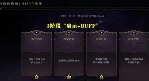 【三阶段】:三阶段开始时,同样需要选择“启示+BUFF”,比如增加攻击力、增加复活币、削弱雾神的力量等等。