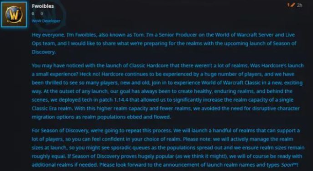 在“探索季”中,玩家的等级上限为 25 级,“玩家将通过搜寻艾泽拉斯寻找改变职业的能力来发现新的秘密。坦克术士、法师治疗师等等都将成为可能,”暴雪在公告中表示,它还会有一个全新的终局游戏,以及一个新的 10 人 Blackfathom Deeps 突袭,其中包含全新和重新设计的 Boss、机制和奖励。
