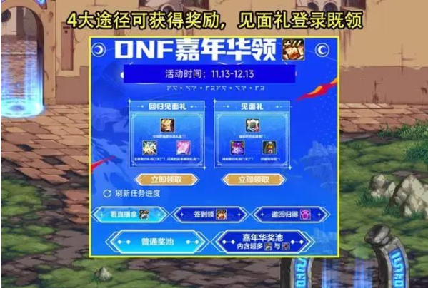 首先,嘉年华上线活动从11.13开始,至12.13结束,总共持续1个月的时间!从活动开始之后主要有4大途径可以获得奖励,分别是见面礼、看直播拿、签到领、以及邀回归得,那么都存在哪些奖励呢?